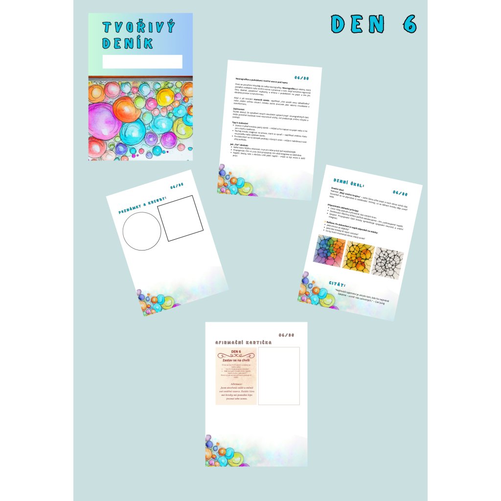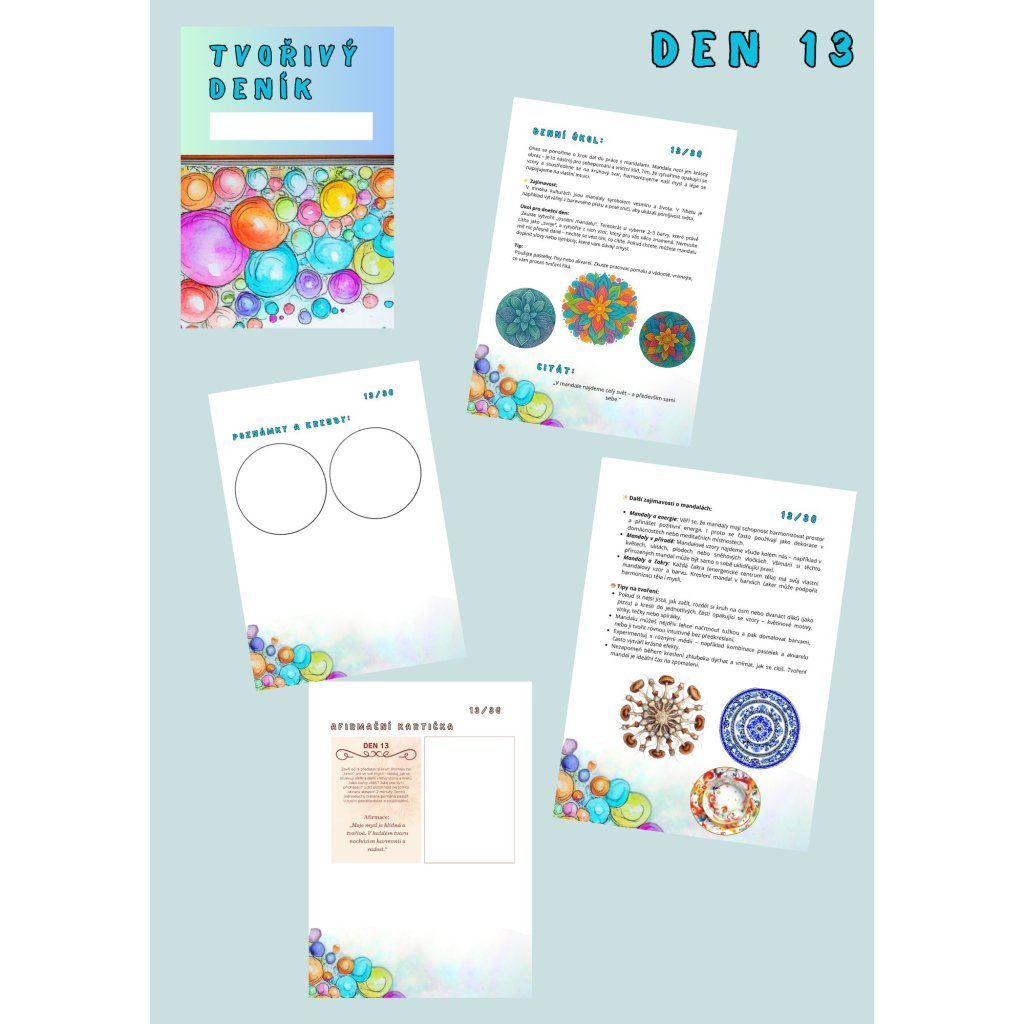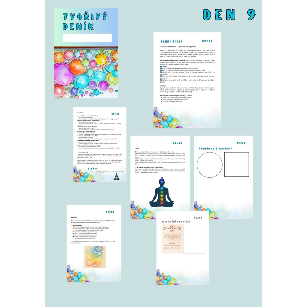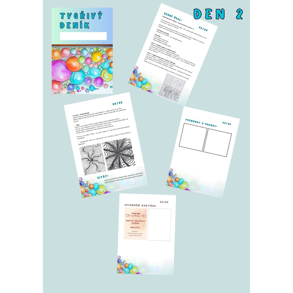 V deníku máš na každý den (celkem 30 dní) pár stránek (někdy více někdy méně)- najdeš tam každý den "denní úkol", vysvětlení jak na něj, vysvětlení nějaké techniky, vzory, předlohy, prostor pro poznámky a kresby, citát, afirmační kartičku s mentálním úkolem. Každý den budeš kreslit malý kousek sebe.