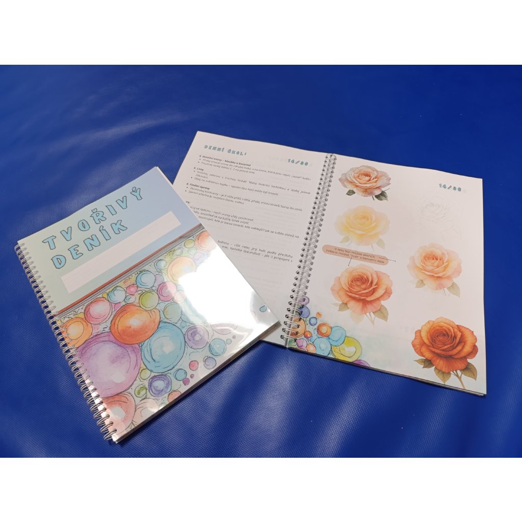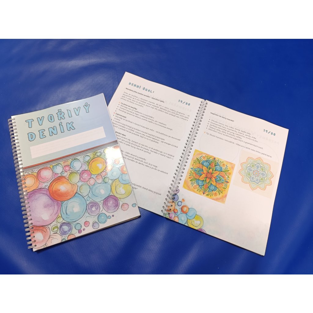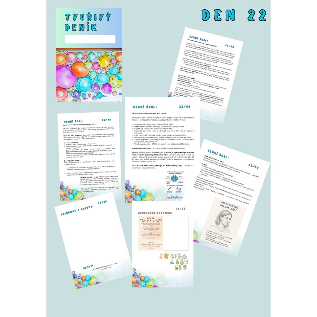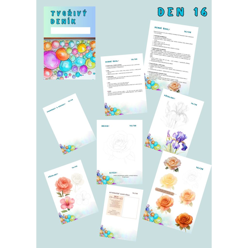 V deníku máš na každý den (celkem 30 dní) pár stránek (někdy více někdy méně)- najdeš tam každý den "denní úkol", vysvětlení jak na něj, vysvětlení nějaké techniky, vzory, předlohy, prostor pro poznámky a kresby, citát, afirmační kartičku s mentálním úkolem. Každý den budeš kreslit malý kousek sebe.