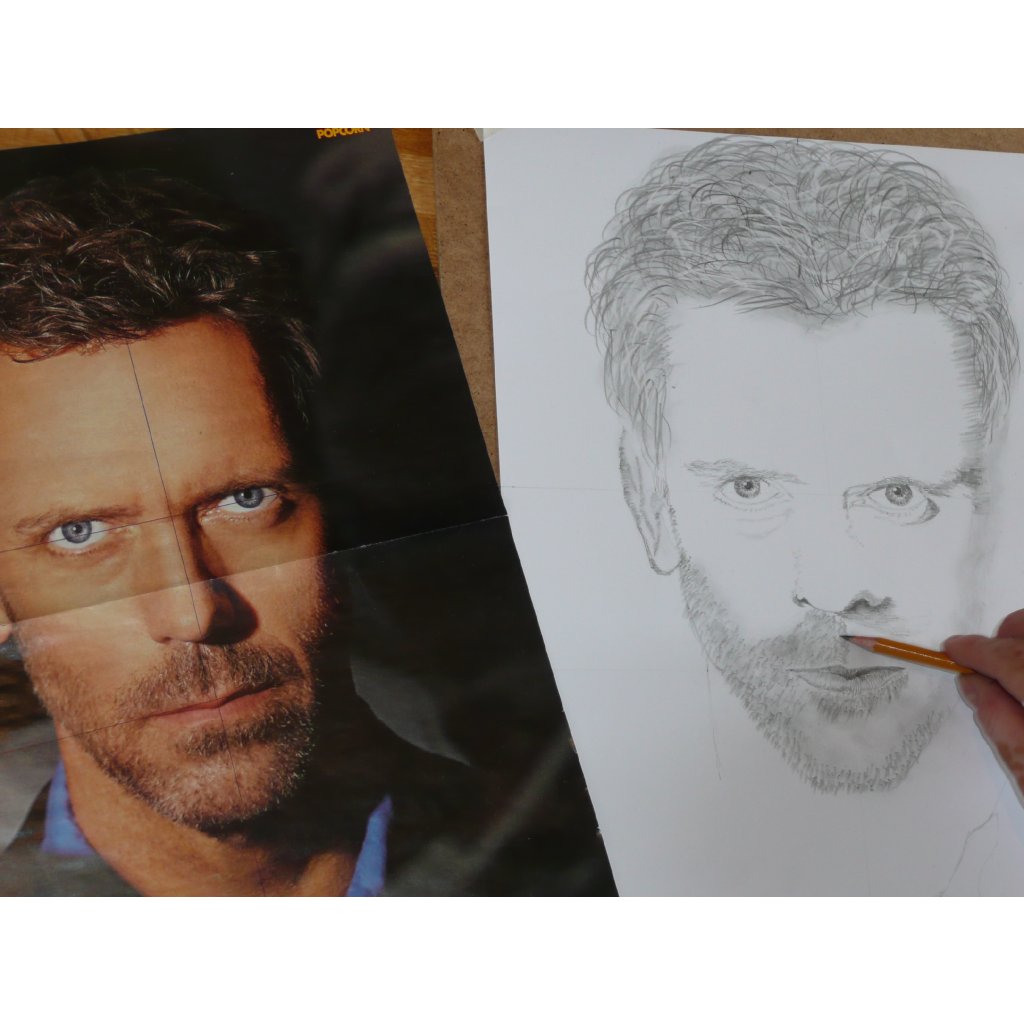 Dále budete potřebovat předlohu- může to být jakákoliv fotografie obličeje - klidně vlastní foto (nebo někoho z rodiny) jen hlava a krk, rozměr A4 - stačí vytištěné z počítače na obyčejný kancelářský papír černobíle - ideálně dvě kopie. Důležité je, aby na fotografii bylo vidět dobře do očí a aby nebyla "rozmazaná" :-). Obličej na předloze musí být co největší přes celou A4. Ideálně prosím vytiskněte 2 kopie. Pokud nebudete mít předlohu, mohu Vám dát nějaké mé předlohy celebrit.